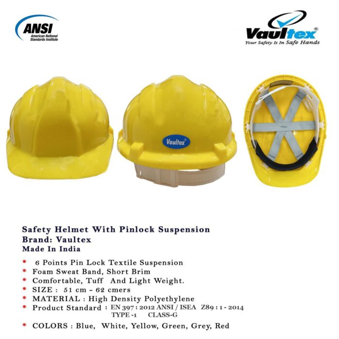 The Vaultex Safety Helmet with Pinlock Suspension is an industrial head protection product designed to provide comfort and safety in hazardous environments like construction and manufacturing. It is manufactured in India and meets both American and European safety standards.